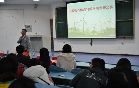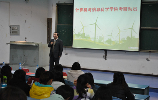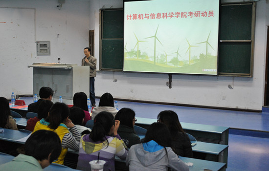 2014年考研动员大会在弘德楼5105教室隆重召开。会议由党总支副书记杨宇老师主持,分管研究生工作副院长杨德刚、专业硕士研究生导师代表李明、杨有、陈代江、唐万梅等受邀出席,2011级辅导员及全体学生参与。