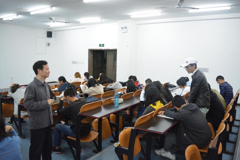 “学高为师,身正为范”进行了解读,并对其中的“身正”引用孟子的“心正则眸子正”来具体阐述,而这八个字的基础在于做人,不失其德,不失其范以彰其学高身正。随后,以“作为大学生和中学生的我们有什么不一样?”为问题与同学进行了讨论,指出中学的外驱动力和大学的内驱动力,让同学们对其大学的学习生活有了一个更深入的了解。之后,以“磨道上的驴,只手的声音”中驴的意象指出主动学习和被动学习目标及结果的不同,并以他亲身经历讲述了在决定考研考博时的心路历程。在互动环节,用提问及讲述禅宗的故事举例告诉同学们要倾听自己的声音,知道自己是谁、想干嘛、一生为自己学习什么。由此引出青春的定义即是成长,并用学习滋养成长,为开花结果存储力量。最后,王老师引用《视驼所种树》中种树的道理来表达了老师们对2017级的同学们的期望和祝福。
