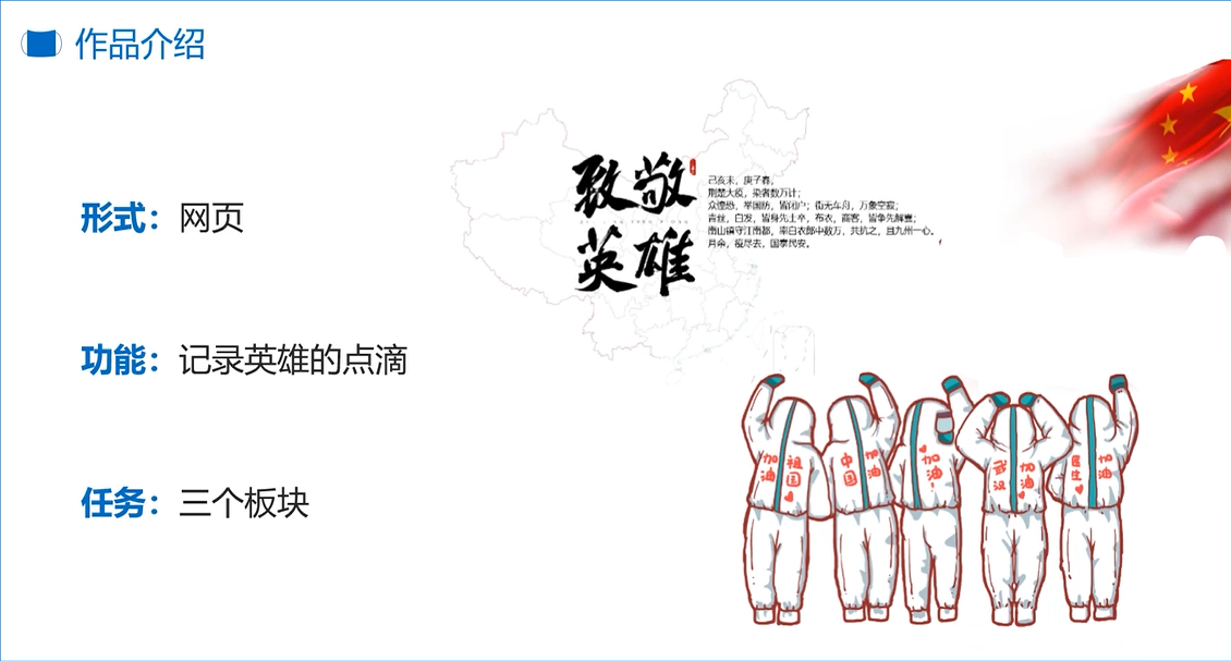 教师中发挥示范作用。今年,新冠肺炎爆发以来,唐老师想到了如何引导学生在疫情中深受教育,组建学生团队完成与疫情相关的项目,既培养学生的编程能力,也加深学生对疫情的感受。在唐老师的精心指导下,学生团队制作了“战役.致敬英雄”网站。用网页的形式记录下了全国各地医护人员和人民解放军支援湖北省的详细数据,以此来纪念此次抗击疫情中的最美逆行者,让我们记住所有为这次疫情做出杰出贡献的可爱的人们,致敬英雄,也愿逝者安息。