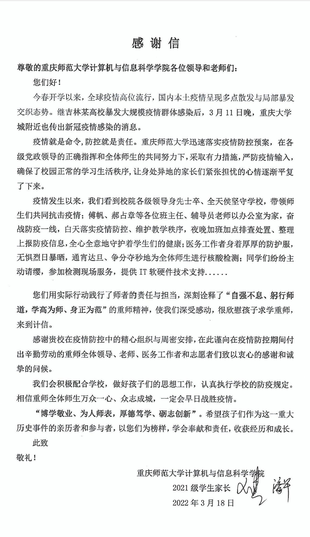 领导、老师们的感谢和慰问。2021级计算机类3班王颢潼学生家长,还专门来信感谢欧美a片