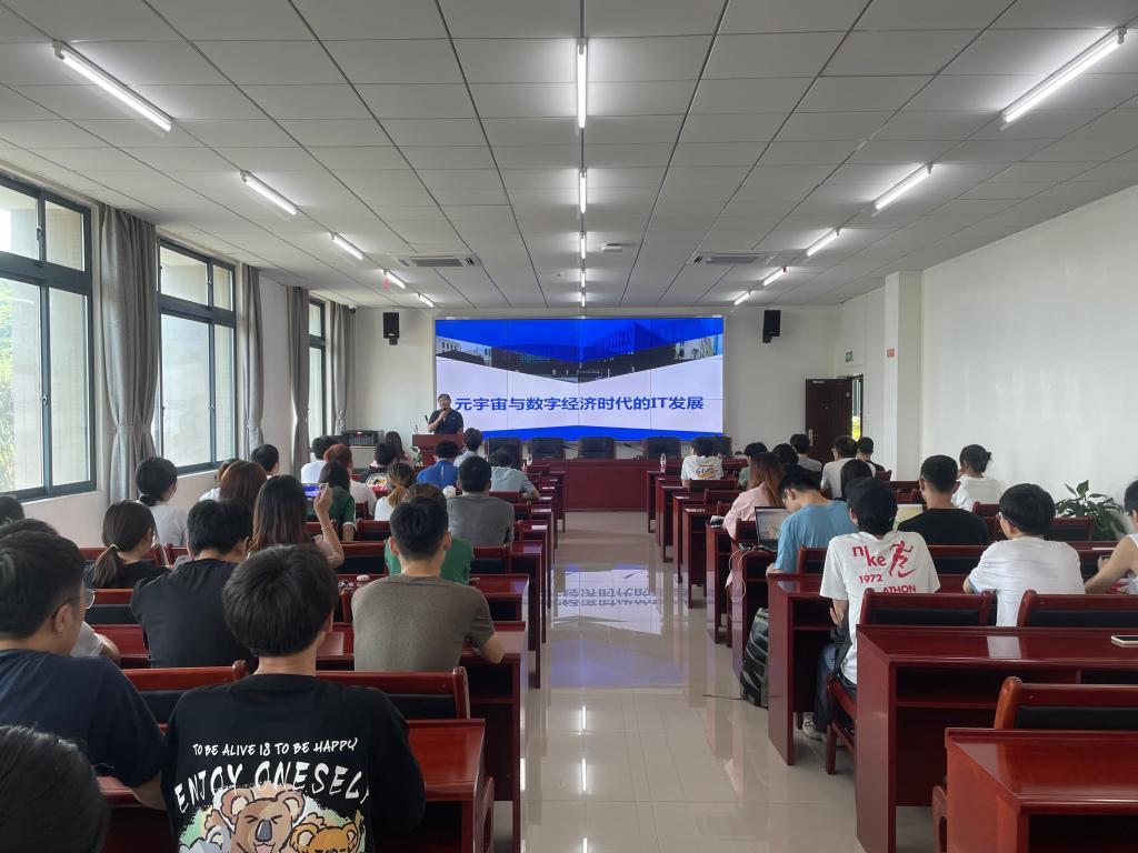的同学们带来了一场别开生面的宣讲会。刘洋总监向同学们介绍了元宇宙与数字经济时代的IT发展,并从IT开发岗位的开发方向以及平均薪资方面,让同学们了解到数字经济与元宇宙已成为未来的发展趋势。接着,他介绍了重庆数字经济人才实训基地,从理念、特色、项目案例等方面展现出实训基地的优势。随后,刘总监详细介绍了创世云招聘技术岗位工程师和迪捷软件组织开展工程实践项目,现场同学也对此表现出浓厚的兴趣,他指出“掌握IT技能是追赶数字经济的捷径”,鼓励学生进行深度学习。