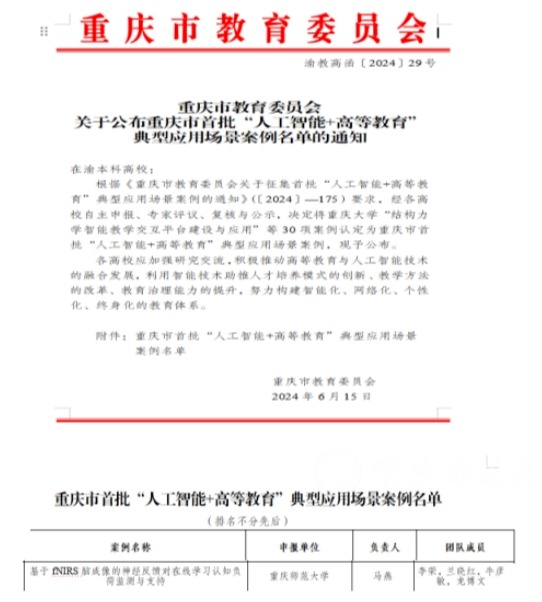 智慧教育研究院马燕教授所带领团队申报的“基于fNIRS脑成像的神经反馈对在线学习认知负荷监测与支持”项目获得重庆市首批“人工智能+高等教育”典型应用场景案例。