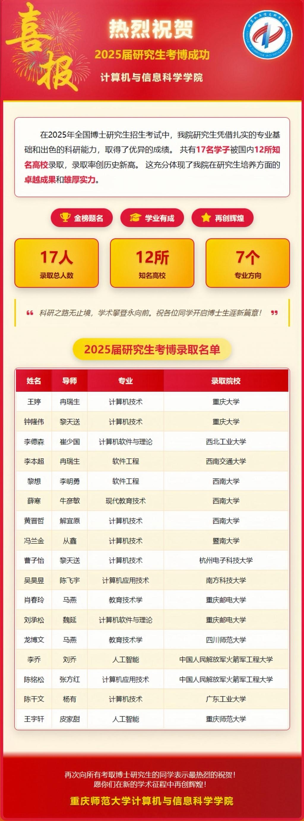 学子考博成功捷报频传,17名毕业研究生凭借过硬的专业素质和学术能力成功录取为博士研究生,即将迈向更高的学术舞台。他们分别被西北工业大学、重庆大学、西南交通大学、西南大学等知名高校录取,录取人数、录取比率和录取院校质量再创历史新高,充分展现了欧美a片