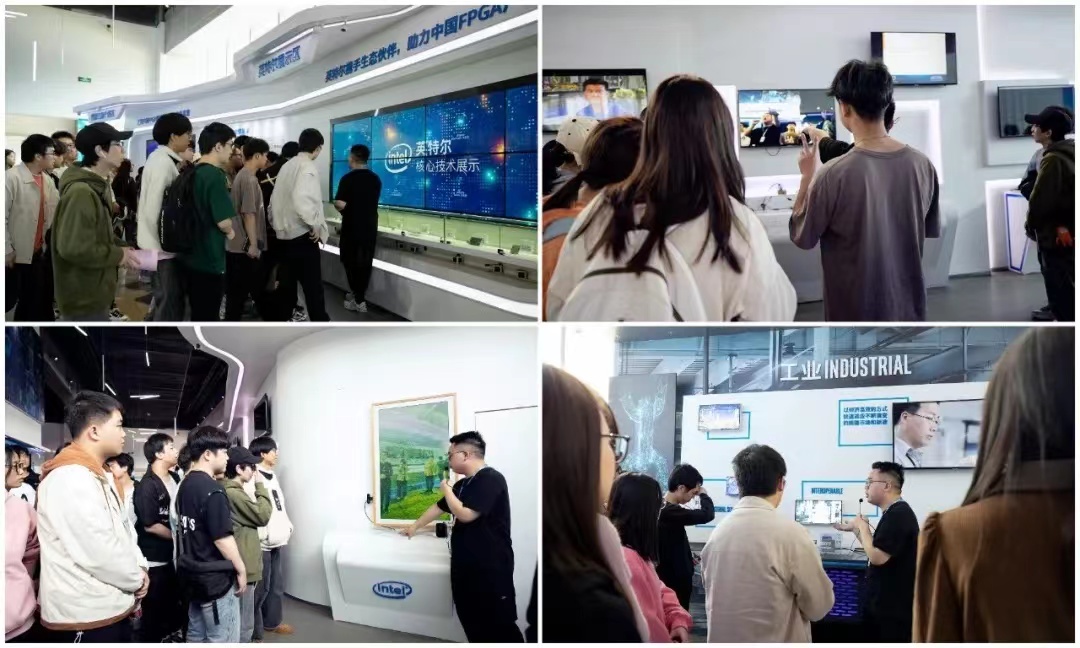 同学们参观了创新中心创新生态展厅,了解到英特尔® FPGA最新科技及解决方案,以及来自人工智能、大数据&云服务、通讯&5G、自动驾驶、视频、工业等多个细分领域的成果及海云捷迅自研的创新成果。同时,企业工作人员还详细介绍FPGA的工作原理、优势以及未来发展趋势。在创新中心的办公区,同学们尝试与科研工作者面对面交流,了解他们的工作内容和研究成果,感受到了科技创新的魅力和力量。