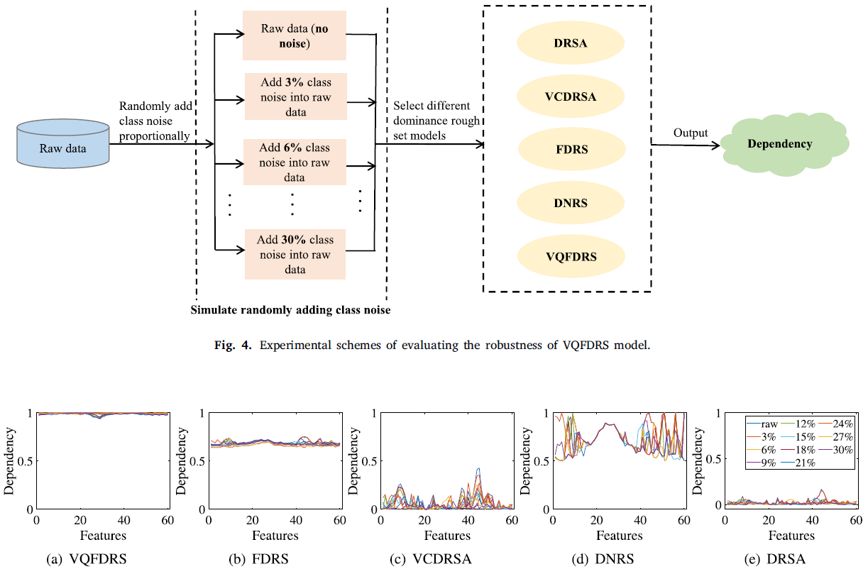 序数分类是一种常见的分类问题,广泛存在于多属性决策问题中基于优势的粗糙集方法(DRSA)是一种适用于有序分类任务的知识获取工。然而,由于收集到的数据中存在噪声信息,导致大大降低了 的学习模型的准确性。提高模型的鲁棒性是解决这一问题的有效途径。此外,现有的基于优势粗糙集的特征选择策略主要关注特征与决策之间的单调分类一致性,而忽略了特征组合提供的分类信息。基于这两个问题,本文提出了一种鲁棒模糊优势粗糙集模型来对抗噪声干扰,并在此基础上开发了一种用于有序分类任务的特征选择方法。首先,采用非线性模糊量词构建鲁棒模型,并引入相关依赖函数。其次,探讨了基于排序熵的不确定性测度,以表征特征组合对有序分类的贡献。在此基础上,提出了一种新的特征评价指标。同时,设计了相应的特征选择算法。最后进行了数值对比实验,结果表明所提出的模型和特征选择算法具有良好的性能。