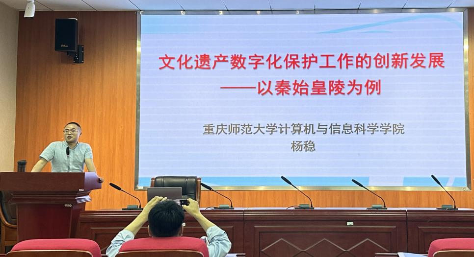 论坛伊始,崔院长介绍了杨稳博士的学术背景、研究方向等。随后,杨稳博士围绕其研究方向及研究成果进行汇报。杨稳博士作题为“数字考古:文化遗产数字化保护工作的创新发展”。他主要围绕秦始皇陵遗址数字化、破损文物虚拟拼接、秦古人颅骨面貌复原、文化资源传播展示等方面做了详细分析于讲解。