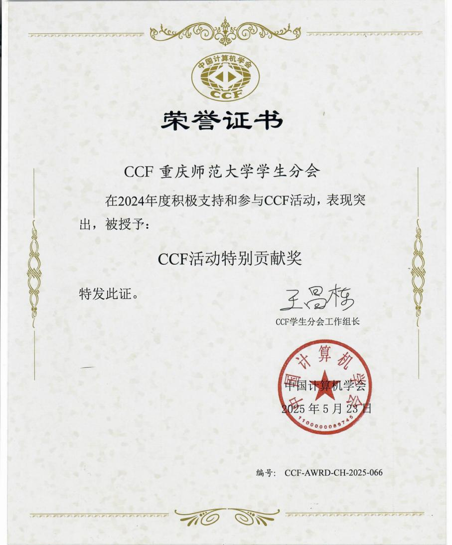 在备受瞩目的颁奖环节,CCF重师学生分会凭借在2024年度积极支持和深度参与CCF各项活动的突出表现,赢得了评委们的高度认可,荣膺“CCF活动特别贡献奖”。这一奖项是对CCF重师学生分会工作的充分肯定和高度赞誉。