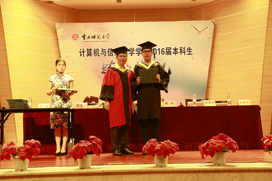 典礼开始,大家共同观看了专题片《2016届毕业汇报》,它记录了2016届毕业生的毕业感言,也记录了大家四年来的点点滴滴,此外,还有老师们对大家送上了祝福与期望。在观看完专题片后,魏延院长为拟取得学士学位证的毕业生授位并合影留恋,院长紧紧握住了每一位同学的双手,肯定了他们大学四年来的成绩。台上是院长的鼓励以及拿到学位证书的喜悦,台下则是同学们依依不舍之情。