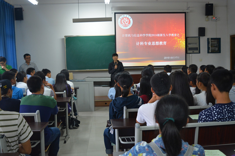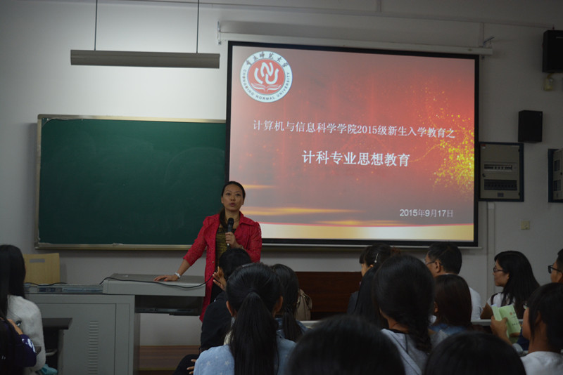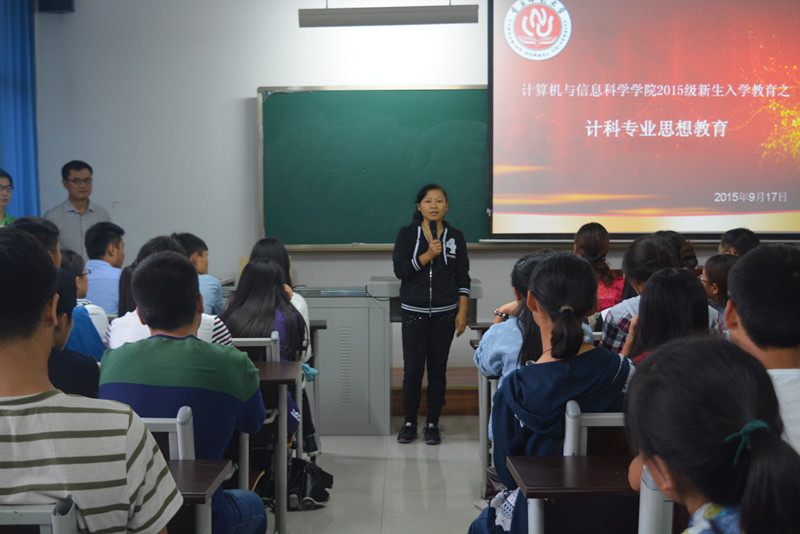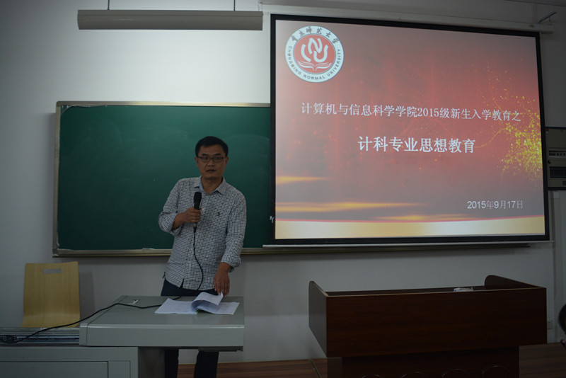 各系教师分别介绍了各自擅长的领域及研究方向和成果。随后,各系进行了分系别讲解,其中计科专业由陈勇老师作为主讲人,给同学们详细的介绍了本专业的课程,同时也对各课程的学分做了详细的解释。陈勇老师说:“ 2015级的学生们处于一个改革期,许多的要求都有或大或小的改变,相比于前几级,学时安排与作业及实践操作安排都将有较大的改革”。陈勇老师还给新生们提出以下要求:第一要有创新意识;第二要不断的制作,从动手方面来查漏补缺;第三,到社会上去抓住实习机会。陈勇老师的专业介绍对帮助同学们树立明确的目标,有效规划大学生活起了重要作用。