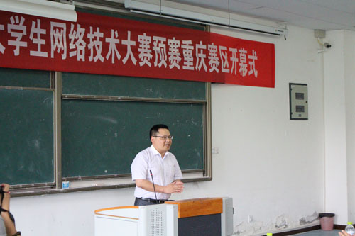 分党委书记刘军、院长李月臣、副院长李世宏、副院长杨德刚、分党委副书记杨宇,华三公司重庆办事处主任刘昆及朱浩雪老师,以及来自重庆赛区16所高校的70多名参赛者参加了开幕式。