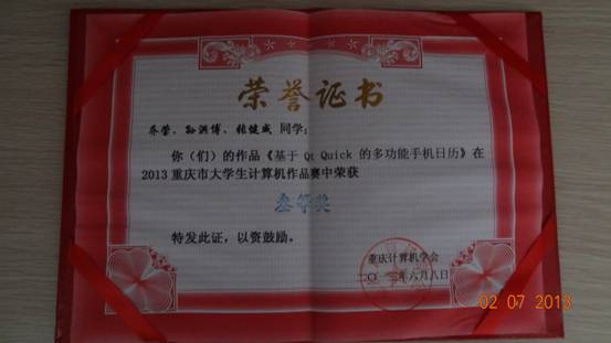 2项参赛作品脱颖而出,分别获得三等奖一个(“基于Qt Quick的多功能手机日历”制作学生:09级软件工程张健威、乔莹和孙洪博,指导老师:龚伟),优秀奖一个(“一卷通智能助手”制作学生:09级软件工程李杰、彭真和余婷婷,指导老师:兰晓红)。