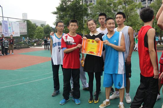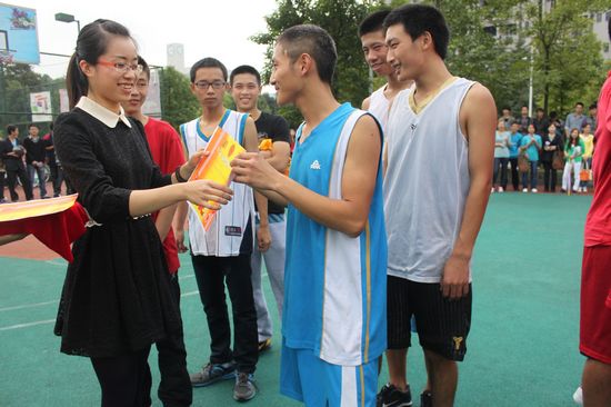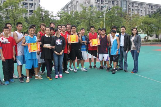 的女生带来了啦啦操表演,优美的舞姿,律动的节奏将比赛推向更高潮。下半场各球员也不忘总结优缺点、分析局势,进而得出更好的应对策略,比赛进入了白热化阶段,“进球,进球!”这是队员们共同的目标。随着那一声声齐呼的“加油”,经过最后的激烈角逐,哨音响起。软工队气势如虹,他们凭着帅气利落的射篮得分为本队赢得决赛,以39:36的比分,捧得了冠军杯。三、四名争夺赛也以电商的获胜,51:38的绝对优势而宣告圆满结束。最后张敬老师及三位辅导员为各团队颁发奖状,队员们赛场上挥洒的汗水,在颁奖典礼上有了最好的回报。