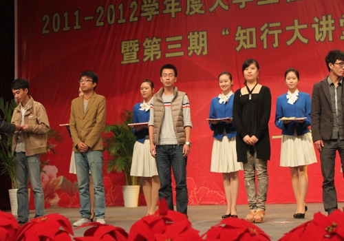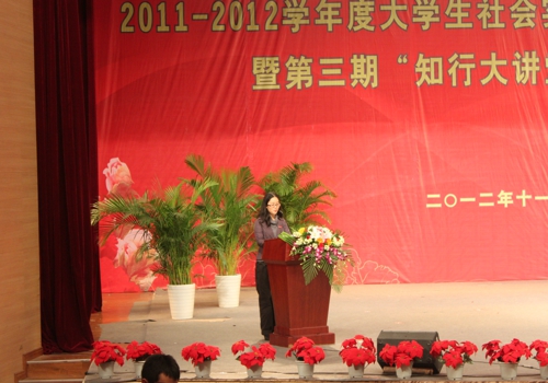在2012年11月1日星期四下午2:30于校友会堂演出厅举办了2011—2012学年度大学生社会实践工作总结表彰大会暨第三期“知行大讲堂”宣讲活动。校党委邓卓明书记、龚燕副书记出席,校团委、学生处、宣传部、财务处、保卫处等部门负责人,及各院学生工作队伍领导老师和受表彰集体与个人参与。