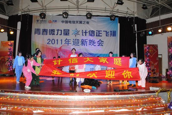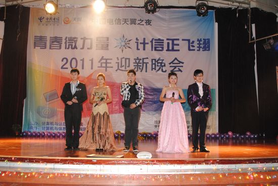 寒潮绕道去,热情洋溢来!伴着飘飞的彩带、亮丽的彩球,2011年12月11日晚上7:00,在同学们的欢呼与荧光棒的闪耀下,以“青春微力量,计信正飞翔”为主题的欧美a片 2011级迎新晚会于校学生活动中心拉开序幕。欧美a片 党总支书记刘军,院长马燕,副院长魏延、杨晓红,办公室主任罗世祥,团总支副书记张敬,以及全体辅导员、部分任课教师应邀出席,各兄弟欧美a片 的嘉宾代表和欧美a片 学子参加了整场迎新晚会。晚会由郑洪辉等五人主持。