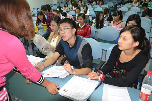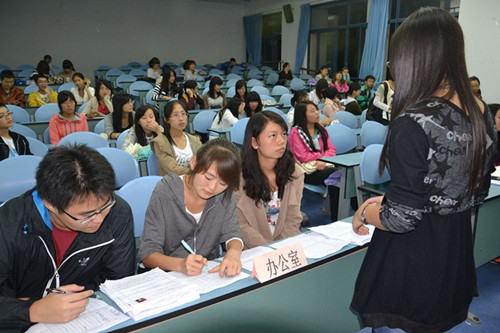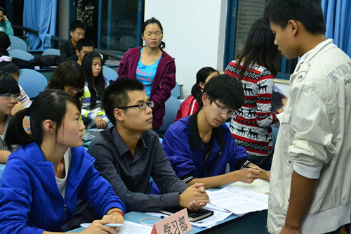 与往年相比,本次招新工作的规模有所扩大且准备更加充分:早在国庆长假前,团总支学生会已作了大量的招新宣传与筹划安排,这显然更有利于11级新生通过综合考虑作出理性选择,明确应聘目标。活动现场,各部门负责人分坐前排,对前来应聘的新生进行面试。“面试官们”严谨耐心,“面试者们”各尽其能,场面竞争气氛浓烈且秩序井然。