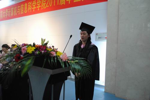 典礼上,学生邓晓霞和戴川作为2011届全体学生代表,向欧美a片 赠送了毕业纪念品——计信加油战鼓一套,表达对欧美a片 领导和老师的衷心感谢,刘军书记代表欧美a片 接受赠礼并击鼓激励人心,全体同学起立高呼:“计信计信,团结奋进!”,雄壮的口号在报告厅久久回荡……随后,刘书记致辞,殷切地希望各位毕业生志存高远、勇于实践、增长才干,创造佳绩、回报母校、报效祖国。