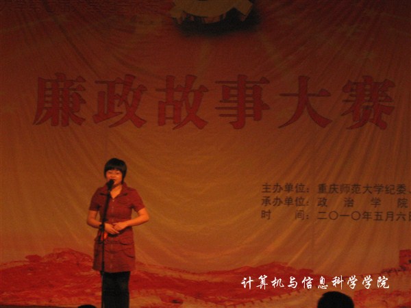 5月6日下午,欧美a片 计算机科学与技术专业08级王露同学代表欧美a片 参加校“廉政故事”大赛,参赛作品《神秘的保姆》讲述了一个关于官员家里老保姆的廉政故事,深得评委的一致好评,最终在18个参赛队当中脱颖而出获得了第六名(三等奖)的好成绩,展现了欧美a片 的风采。