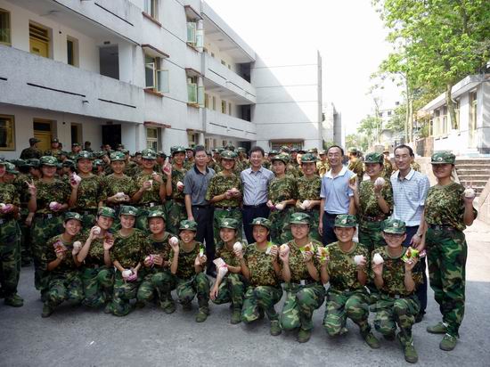 特意带去的慰问礼物——月饼和苹果,祝愿大家在军训基地能过上一个有滋有味的中秋节。最后,领导们在参观完新生们的寝室内务和食堂后,鼓励同学们再接再厉,注意天气冷暖,圆满完成军训任务