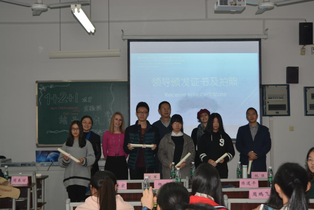 领导为参加“重庆师范大中美1+2+1项目”的同学们颁发结业证书。当同学们拿着毕业证书与老师们合影时,脸上都情不自禁的露出了笑容。