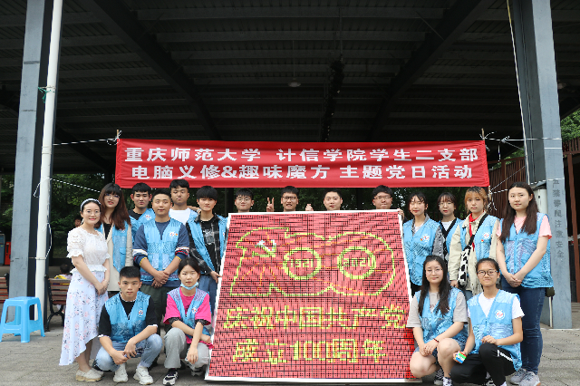 期间,魔方协会结合建党百年的契机,在现场教学利用900块魔方拼接成建党百年的标识,并配以“庆祝中国共产党成立100周年”的字样,体现学生党员与党、与祖国的同心同向同行,并表达了对党深沉的热爱。最后,活动在学生二支部书记刘宇老师的发言声中圆满结束。