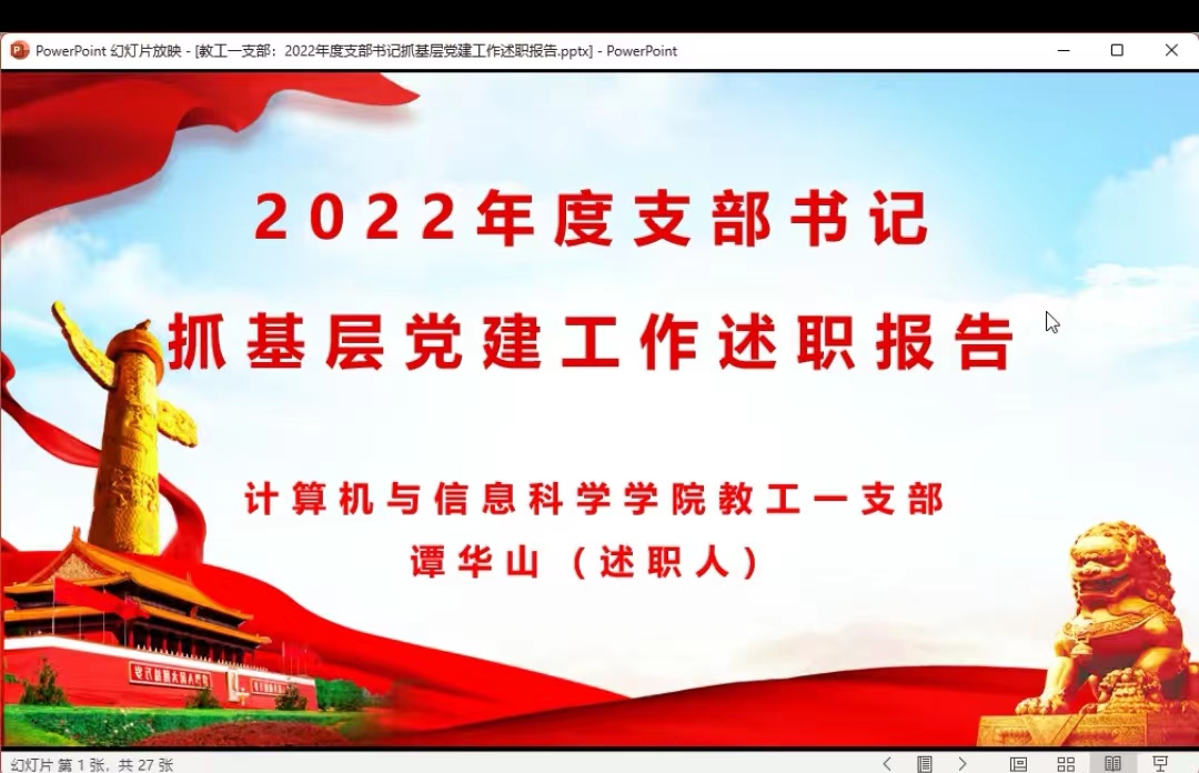 大会上,各位党支部书记逐一进行述职。教工一党支部书记谭华山老师谈到,教工一党支部始终坚持政治理论学习摆在首位,扎扎实实开展理论学习和形式丰富多样的主题活动,广大党员在疫情期间发挥先锋模范作用,下沉社区,发光发热;教工二党支部书记叶青老师介绍了疫情期间支部的业务工作与党建工作有机结合,支部教师党员交流探讨如何熟练运用网课平台,提高网课教学质量。叶老师还特别针对“网课爆破”这类突发事件,通过案例教学,生动演绎网络爆破模拟,让大家防患于未然,增强互联网课堂掌控本领;研究生一党支部书记宋婷婷老师详细介绍了支部本年度开展的组织生活,重点介绍了支部如何努力完善管理制度、打造特色亮点活动以及疫情期间党员同志的先进事迹;研究生二党支部蒋明宇老师谈到,本党支部将志愿活动与科研活动有机结合,着力打造以科研帮扶为主的志愿者活动,开展过两次大型的论文指导和竞赛指导现场交流活动,党员与群众双方展开科研思想碰撞,充分发挥朋辈互育,党员学生的领雁作用;研究生三党支部书记曹光老师谈到,研究生三党支部成立于2022年4月,自支部成立以来,把党建工作与日常工作紧密结合,同研究同部署,与支委会成员一道推进支部建章立制,小处着手,细微处发力,提升支部管理水平,充分展现新支部全新的面貌。本科生一党支部靳蜜静老师突出介绍了通过抓思想建设,鼓励党员注重专业融合和综合发展,培养了一批肯吃苦、能战斗、素质硬的党员先锋典型。学生二党支部书记刘宇老师结合样板支部建设过程,介绍创新学习机制,开展“党课我来讲”先锋课堂;学生三党支部钟华老师进一步打造支部特色,完善支部品牌,持续推荐党员培养教育计划,将学习、交流、表率、成果融为一体,推动支部建设走深走实。