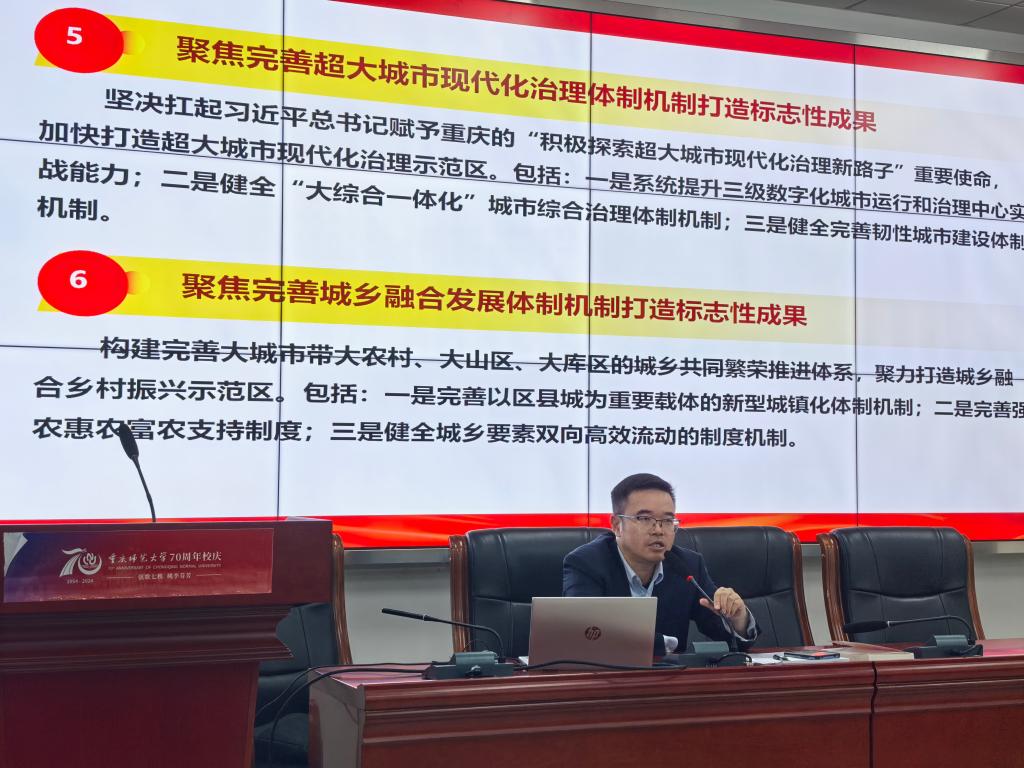 王军首先回顾了改革开放以来党的历届三中全会的情况,接着从深入学习领会习近平总书记在全会上的重要讲话精神,全面准确理解全会《决定》提出的进一步全面深化改革的重大举措,贯通学习习近平总书记对重庆改革工作的系列重要指示要求,推动全会精神在全院落地见效等方面对全会精神进行了宣讲。
