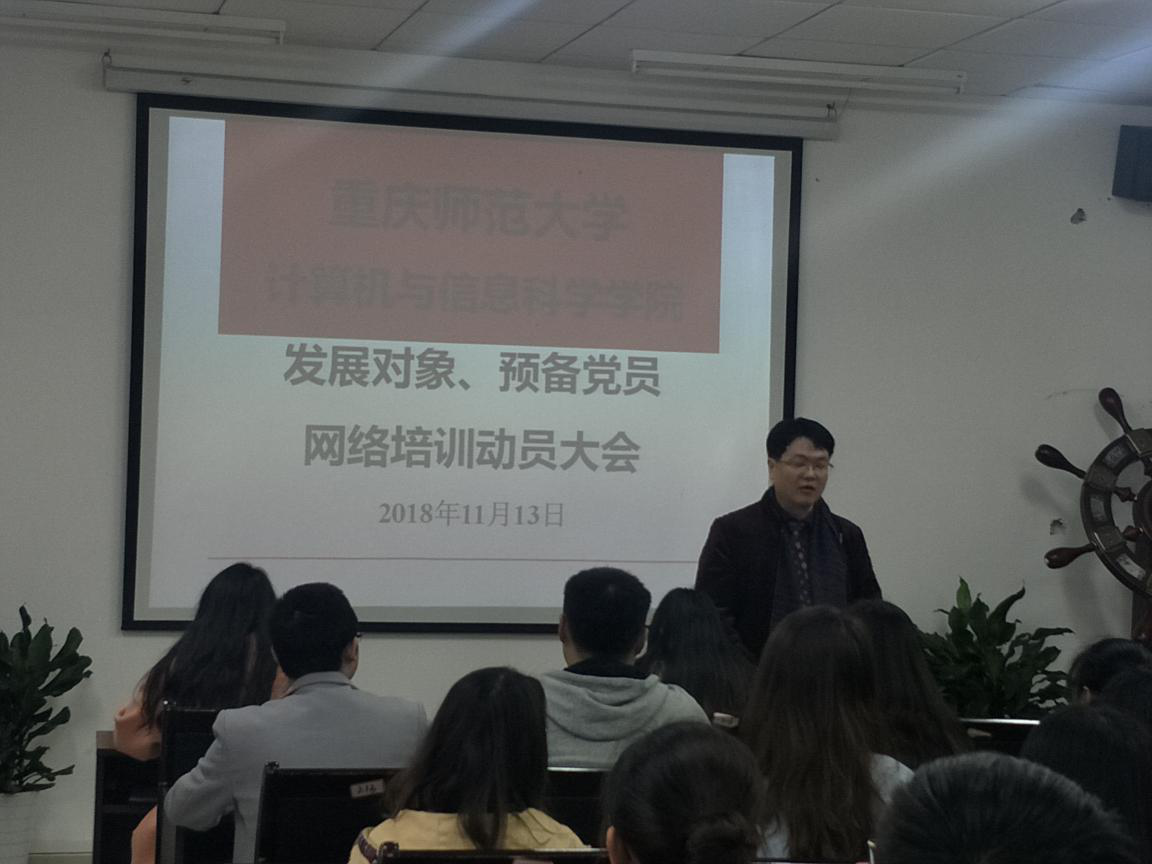 为加强发展对象、预备党员对网络学习流程的了解,增强网络学习的积极性。为此,2018111313时,欧美a片 特于欧美a片 楼213教室开展发展对象、预备党员网络培训动员大会。本次活动由孙柳艳主持,欧美a片 党委副书记何东老师、学生二支部书记刘宇、学生三支部书记钟华出席,全院参加此次网络学习的发展对象、预备党员共计72名同学参与学习。