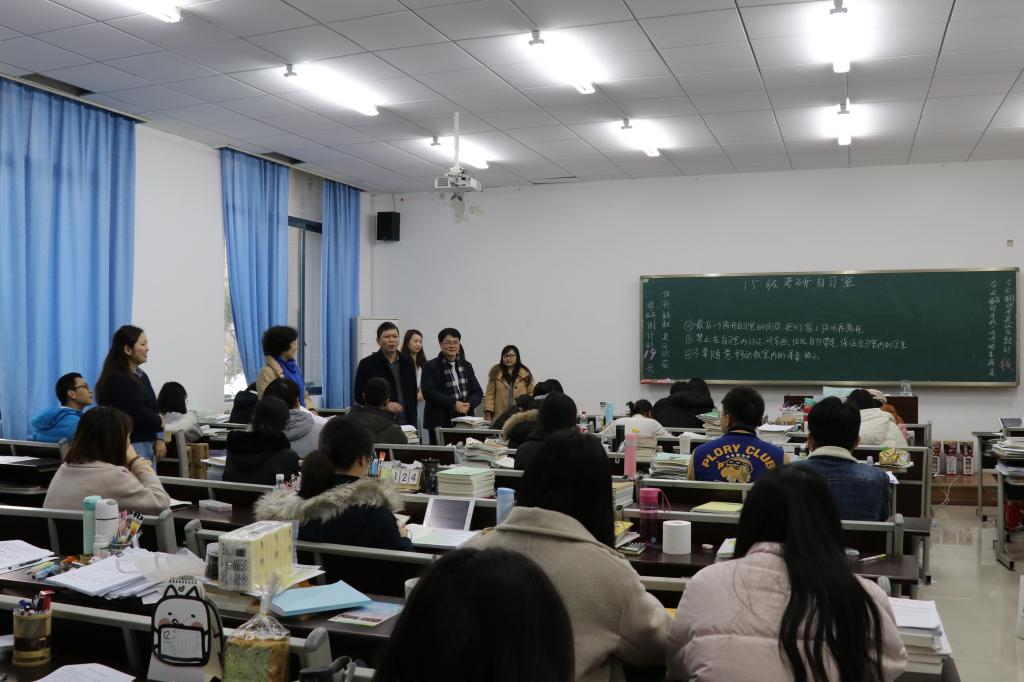2018年12月3日17:00,欧美a片 党委书记陈兰、院长魏延、党委副书记何东、团总支书记钟华、15级辅导员孙柳艳前往欧美a片 考研自习室慰问2015级考研备考学子。
