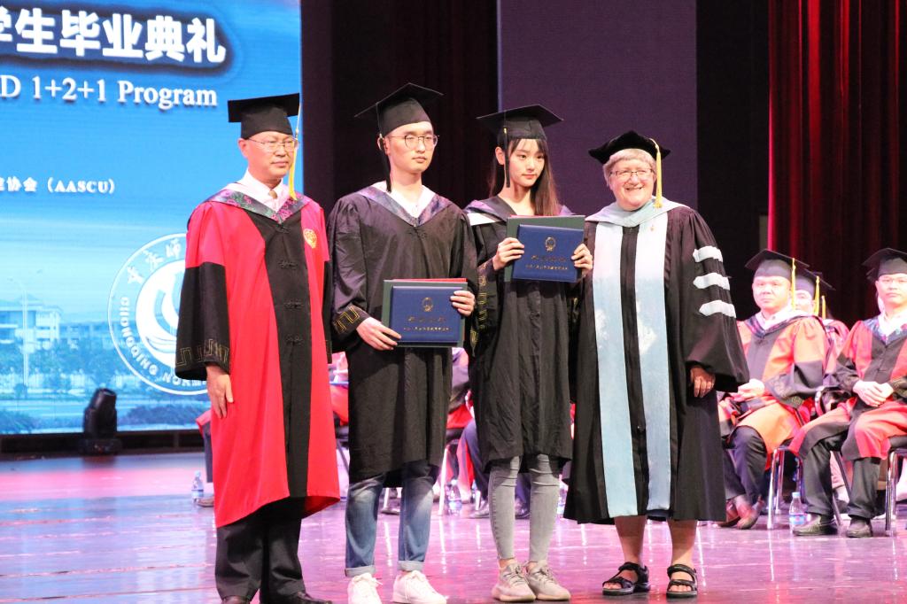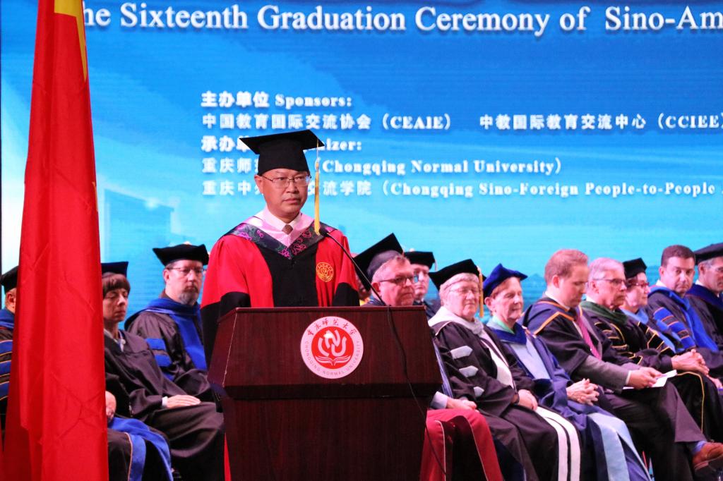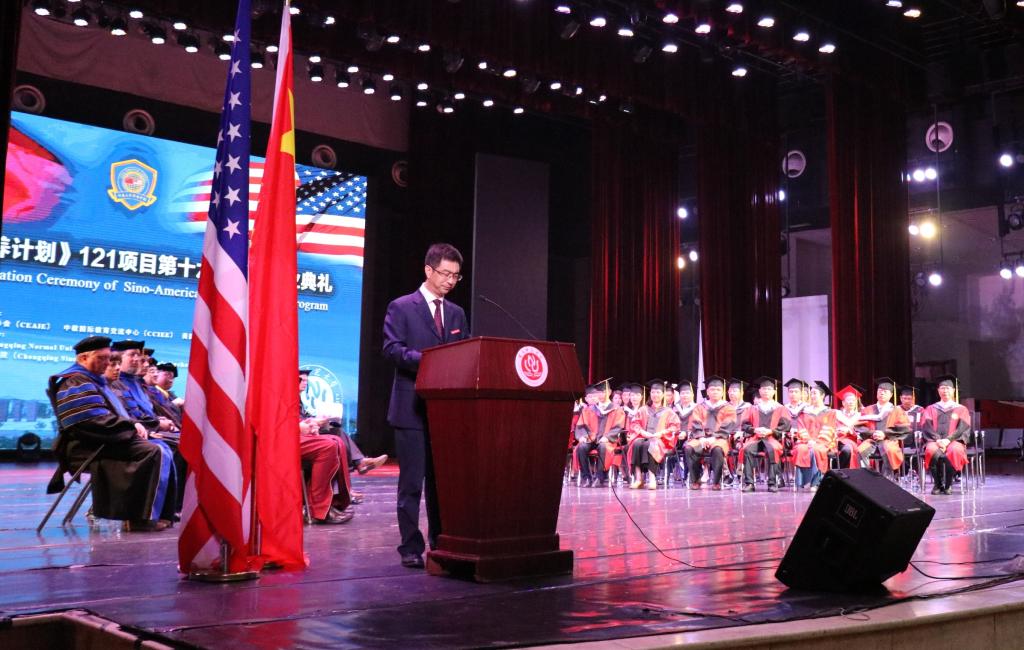 概况,近年来的发展战略、成就与在中美121项目上取得的成果,以及对各位毕业生寄予的殷切希望。中美双方各大学领导人向第十六届毕业生颁发毕业学位证书。美国北亚利桑那大学国际事务副校长林言成,中教国际教育交流中心121项目总监王颖博士主持了仪式。接下来,中教国际教育交流中心印凯主任宣布了关于表彰《中美人才培养计划》121项目2019年度优秀毕业生的决定。随后,印凯主任和美国特洛伊大学杰克·霍金斯校长向中美121项目2019年度优秀毕业生代表颁奖。颁奖结束后,中美121项目第十六届毕业生代表,欧美a片