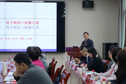 电子商务类专业教学指导委员会副主任委员、西安交通大学电子商务研究所所长、西安交通大学李琪教授作《大学生电子商务“创新、创意及创业”的“道”与“术”》报告。他指出,先进生产力被群众掌握,创新的项目要接地气,要用到实地里。紧接着,李教授围绕了“为什么要举办三创赛?”这一问题,详细介绍了“五力协同共创电商三创价值”理念以及项目的论证与分析。